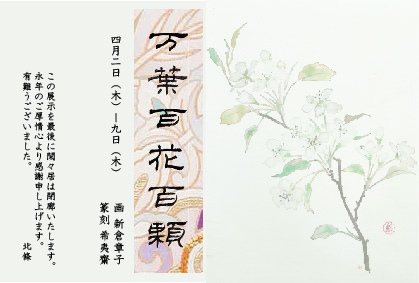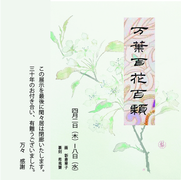 画家 新倉章子さんと篆刻家 希夷齋さんのコラボ作品集が上梓されました。原画15枚を展示いたします。また「万葉百花百顆」も販売いたします。(価格 4,000円)